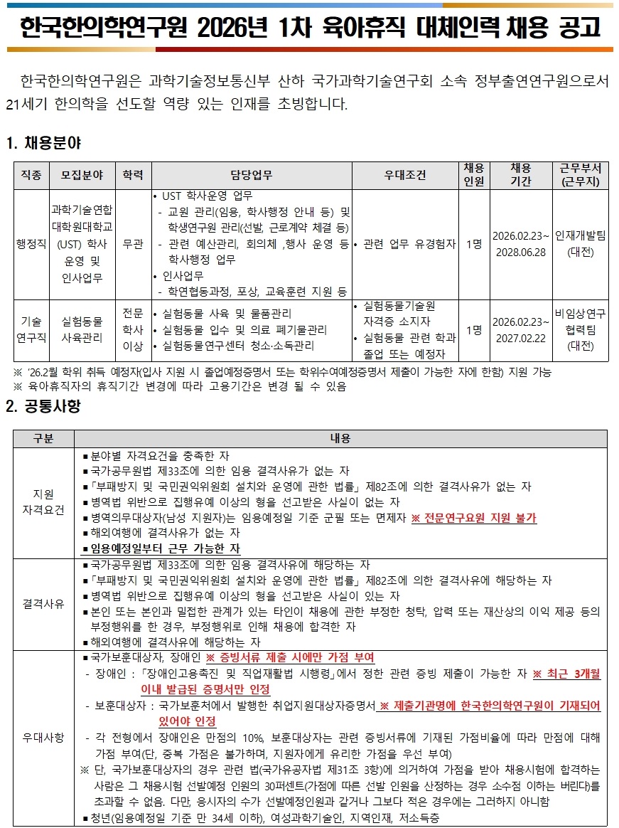 2026년 1차 육아휴직 대체인력(계약직) 공개채용 공고