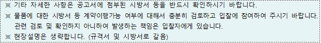 ※ 입찰자가 면세사업자인 경우 입찰금액은 반드시 부가가치세를 포함하여 투찰하여야 하며, 개찰결과 낙찰자가 면세사업자인 경우 낙찰금액에서 부가가치세 상당액을 차감한 금액을 계약금액으로 함.
